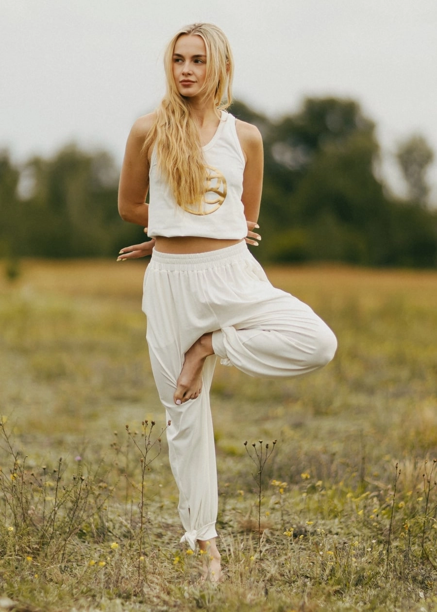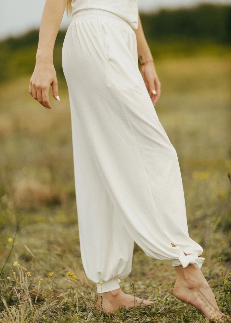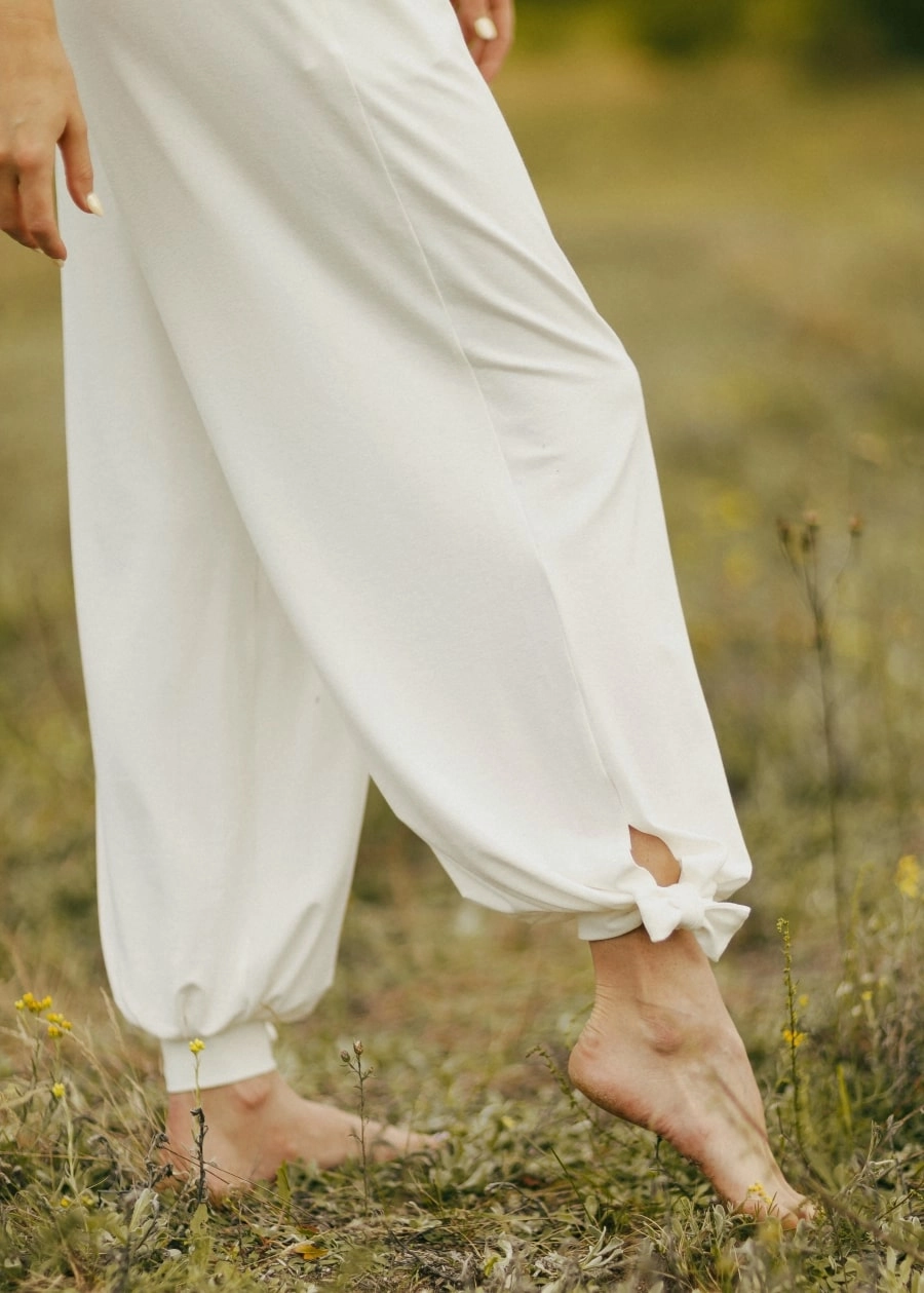 Luźne spodnie do jogi, wykonane z białej, gładkiej i miękkiej wiskozy, z kieszeniami i wiązaniami na dole nogawek, pozwalającymi na regulację i dostosowanie szerokości spodni w kostkach. W pasie szeroki pasek z gumką. Stylizacja oparta o takie spodnie to hit nadchodzącego sezonu i sygnał wysłany do otoczenia, że jesteś osobą kreatywną i nie bojącą się modowych wyzwań. Nasze spodnie do jogi idealnie będą się komponować z białymi lub kremowymi topami lub bluzkami do jogi.