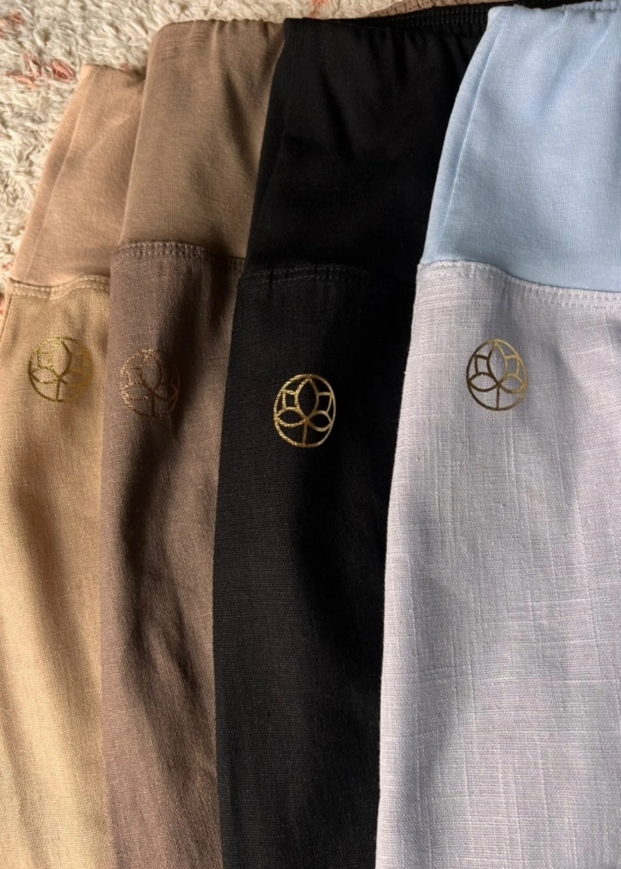 Spodnie do jogi lub pilatesu wykonane z lnu z dodatkiem wiskozy, z karczkiem z dzianiny, miękko dopasowującym się do talii. Krój zapewniający swobodę ruchów, zaszewki na wysokości kolan i gumka w nogawkach.