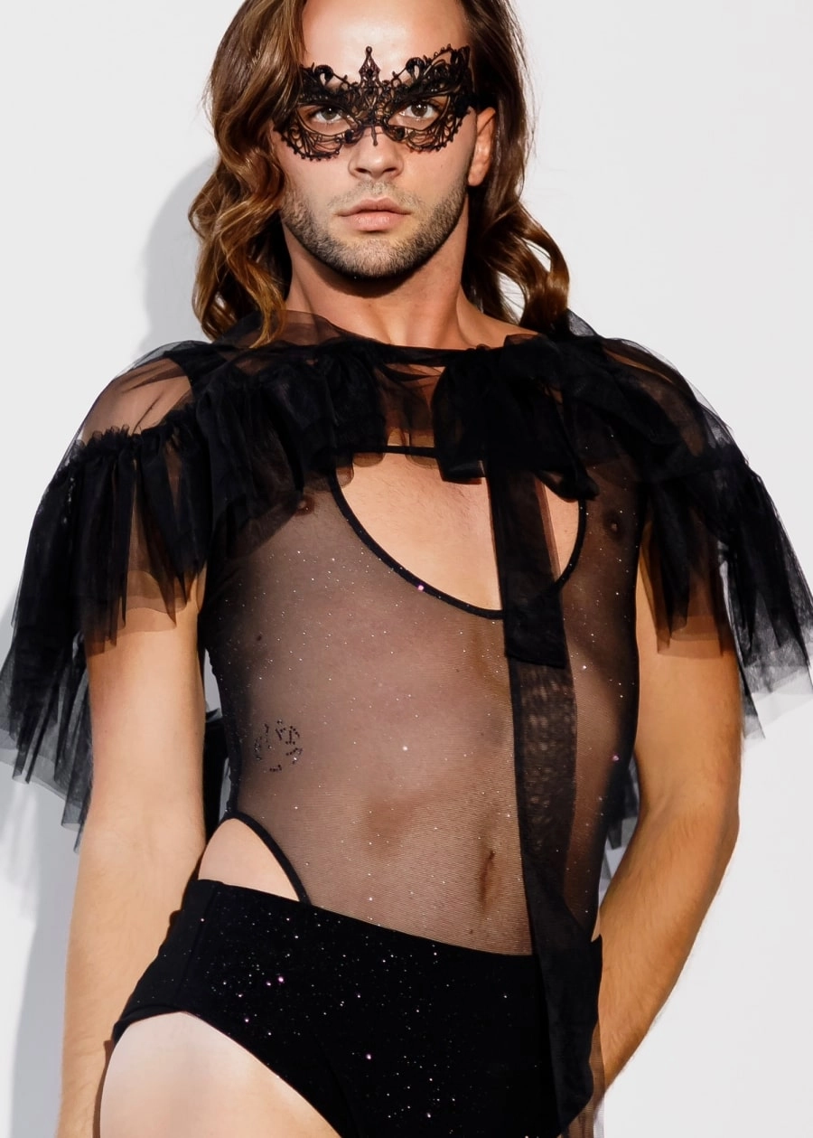 Wykonane z ekskluzywnej, marszczonej włoskiej siatki z brokatem. Dekolt, z elastycznym paskiem spinającym na piersiach, może być noszony zarówno z przodu jak i na plecach, zależnie od stylizacji stroju.