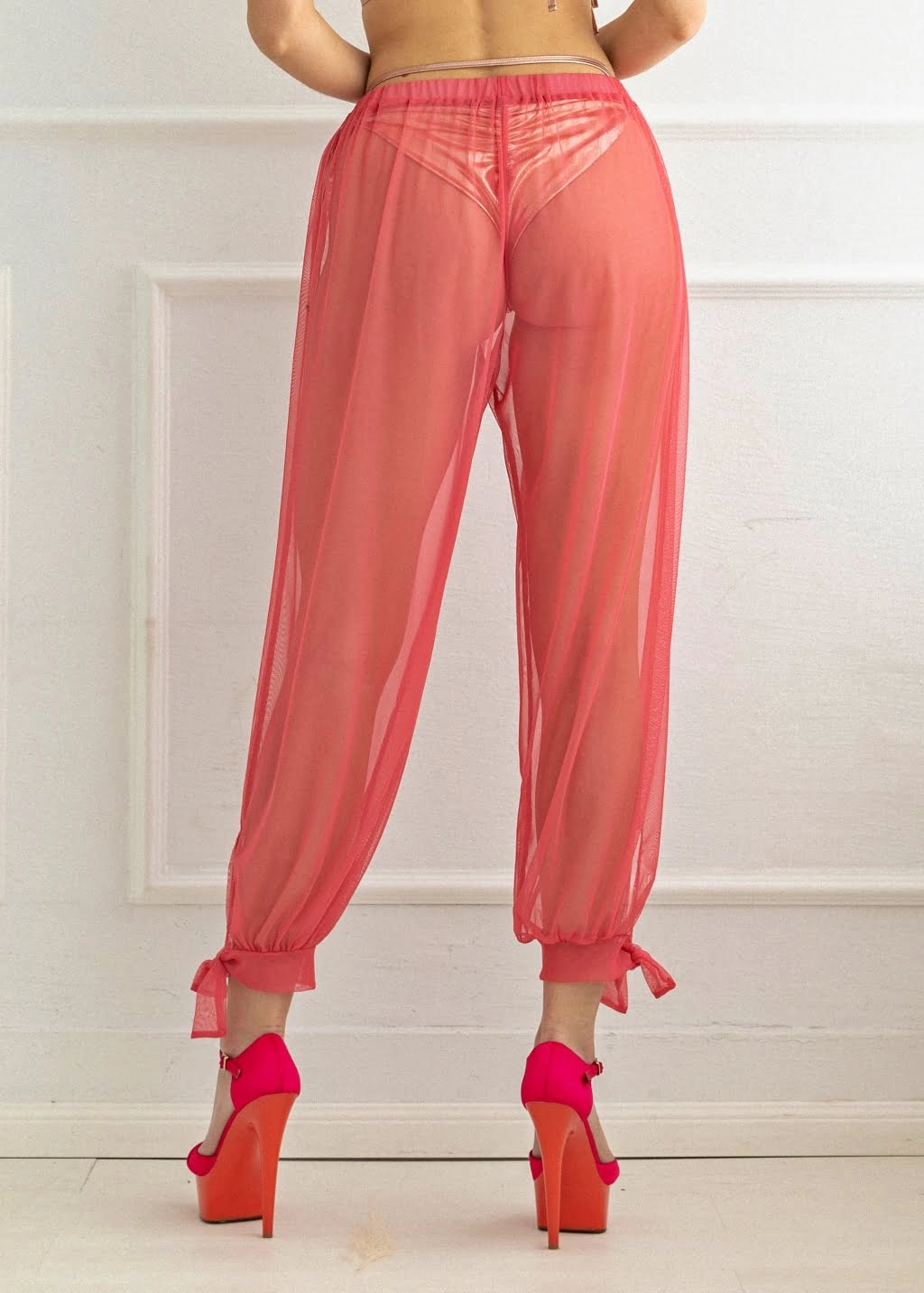 Spodnie do exo o luźniejszej formie, z przeźroczystego materiału, pięknie falujące i układające się "do ciała" podczas tańca. Wiązania w dole dodają seksapilu i idealnie pasują do high heelsów.