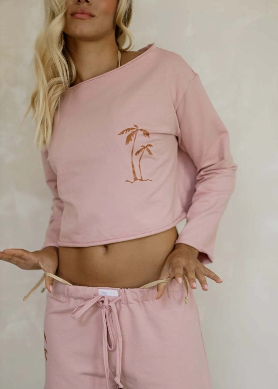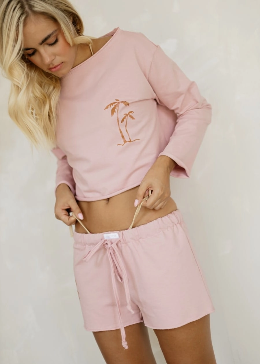 Komplet plażowy z bawełnianej dzianiny w kolorze pudrowego różu, z ręcznie malowanymi palmami. Komplet składa się z krótkiej oversizowej bluzki z łódkowym dekoltem i surowym wykończeniem brzegów oraz spodenek z wiązaniem w pasie.