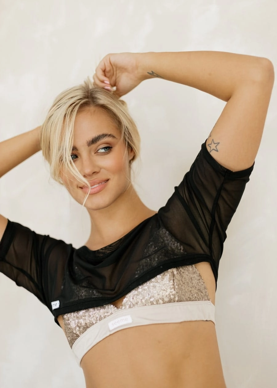 Do skompletowania ze złotymi majtkami bikini TEMPTING GOLD lub zabudowanymi majtkami TEMPTING GOLD. Na zdjciach widać również krótką bluzkę exo ALEXA BLACK.