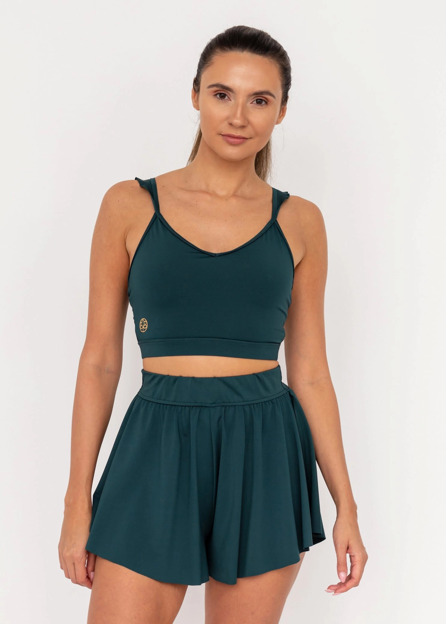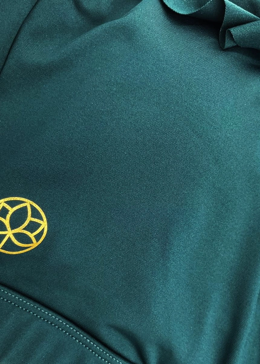 Wykonany z gładkiej, matowej lycry w kolorze butelkowym, z ozdobnym złotym logo.