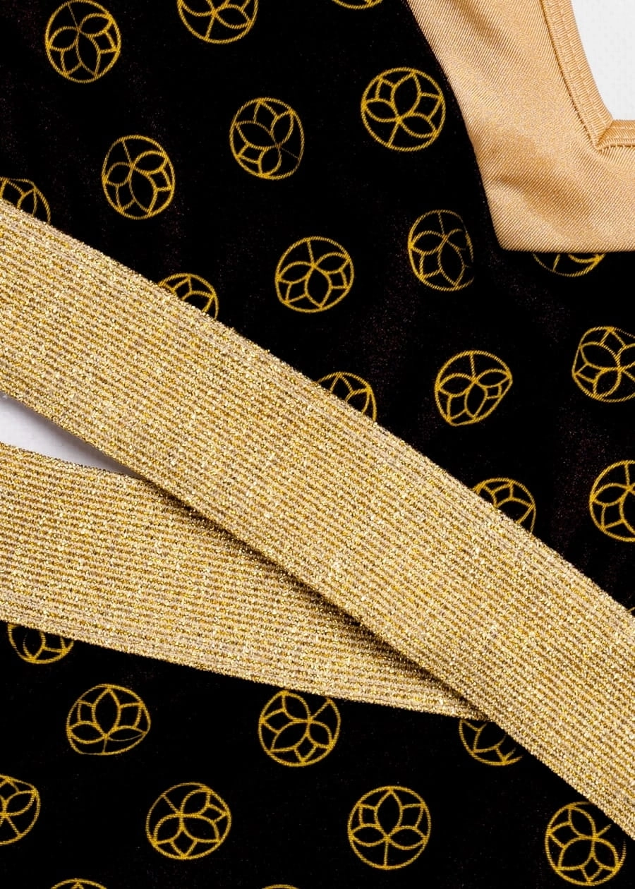 Niezwykły top o ciekawej formie, zaprojektowany tak aby idealnie podkreślić biust i figurę. Zabawa deseniami dała zaskakująco fajny efekt, połączenie delikatnego złota i czerni ze złotym nadrukiem w logo SeeMe, oraz złotej metalicznej gumy to prawdziwy hit.